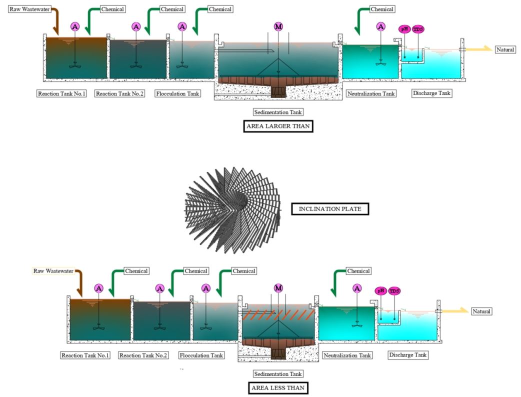 So It is possible to smaller Layout of Sedimentation tank by Inclined plate. Offcourse Inclined plate is able to use for wastewater treatment plant of Both Biological Treatment and Heavy Metal Treatment. It well adopted for modificating Existing wastewater Capacity up.